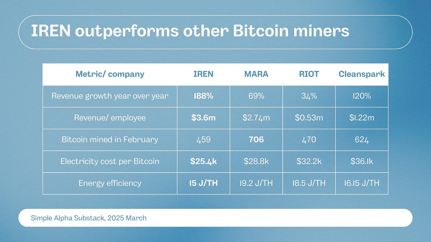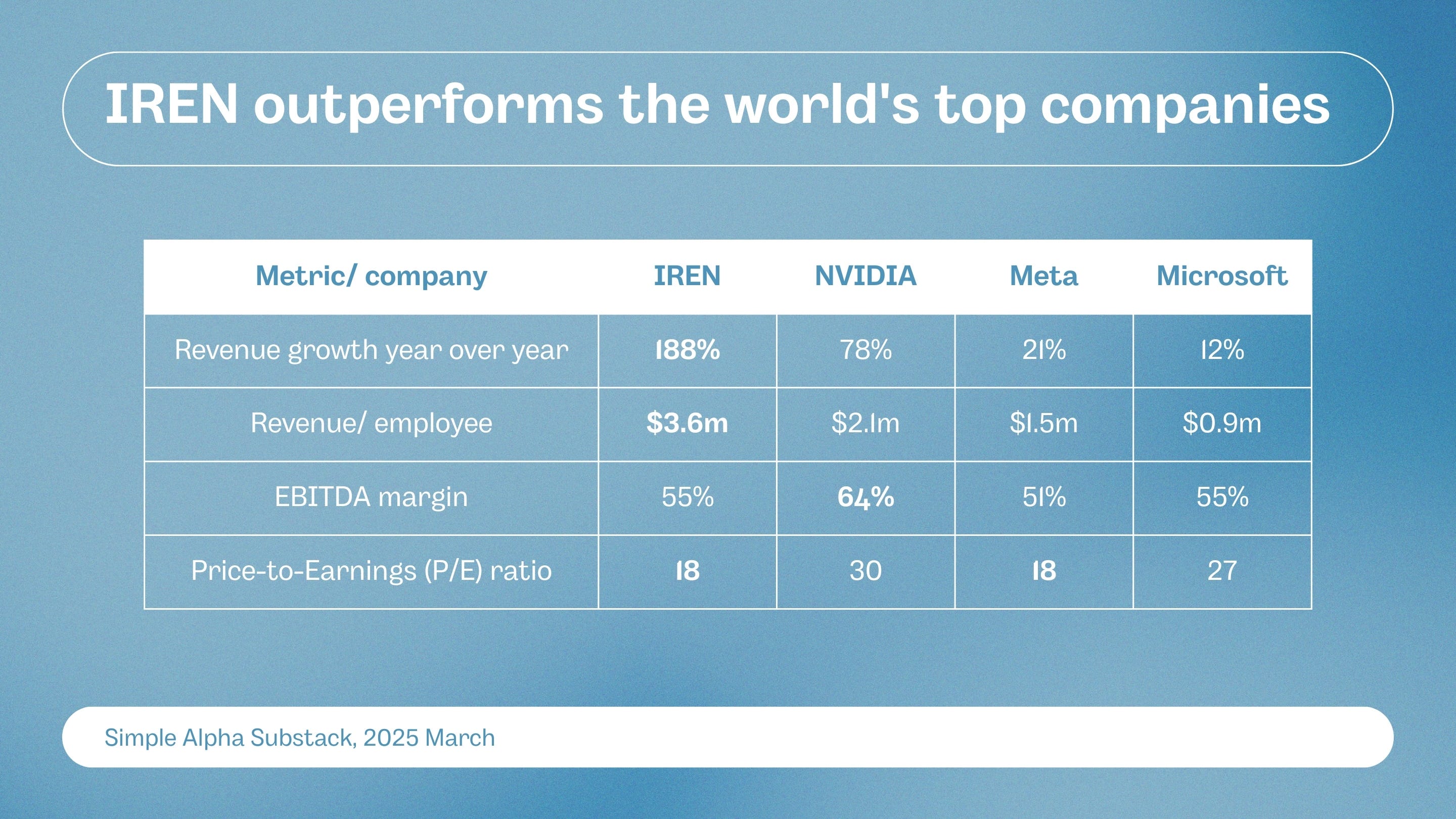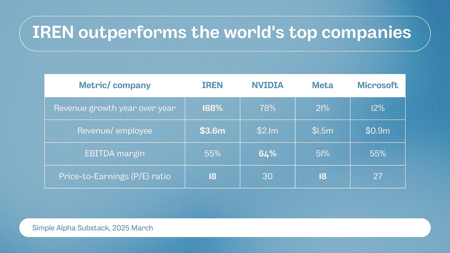 Alright, so we’ve established: IREN is profitable, growing, undervalued, and crushing the competition.